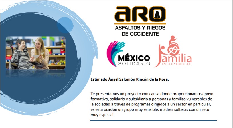 Como parte de un apoyo a la comunidad, Aro asfaltos realizo un donativo al programa Familia Incluyente, que tiene como objetivo apoyar a madres solteras con hijos con necesidades especiales, haciendo capacitaciones y brindado apoyo a las familias.