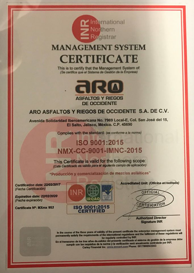 El pasado 22 de Febrero La empresa INR (International Northerm Registrar) le Otorgo el certificado a Aro Asfaltos y Riegos de Occidente S.A. de C.V. por el cumplimiento de los requisitos de la Norma ISO 9001:2015 del sistema de gestión de CALIDAD.